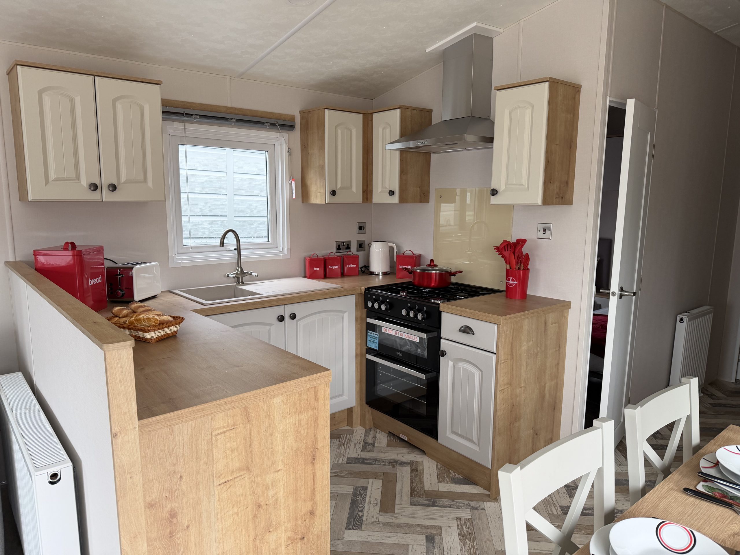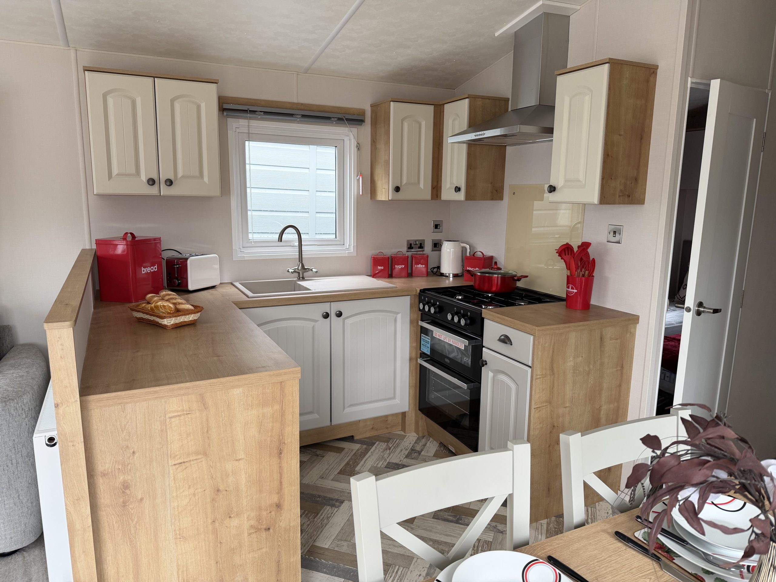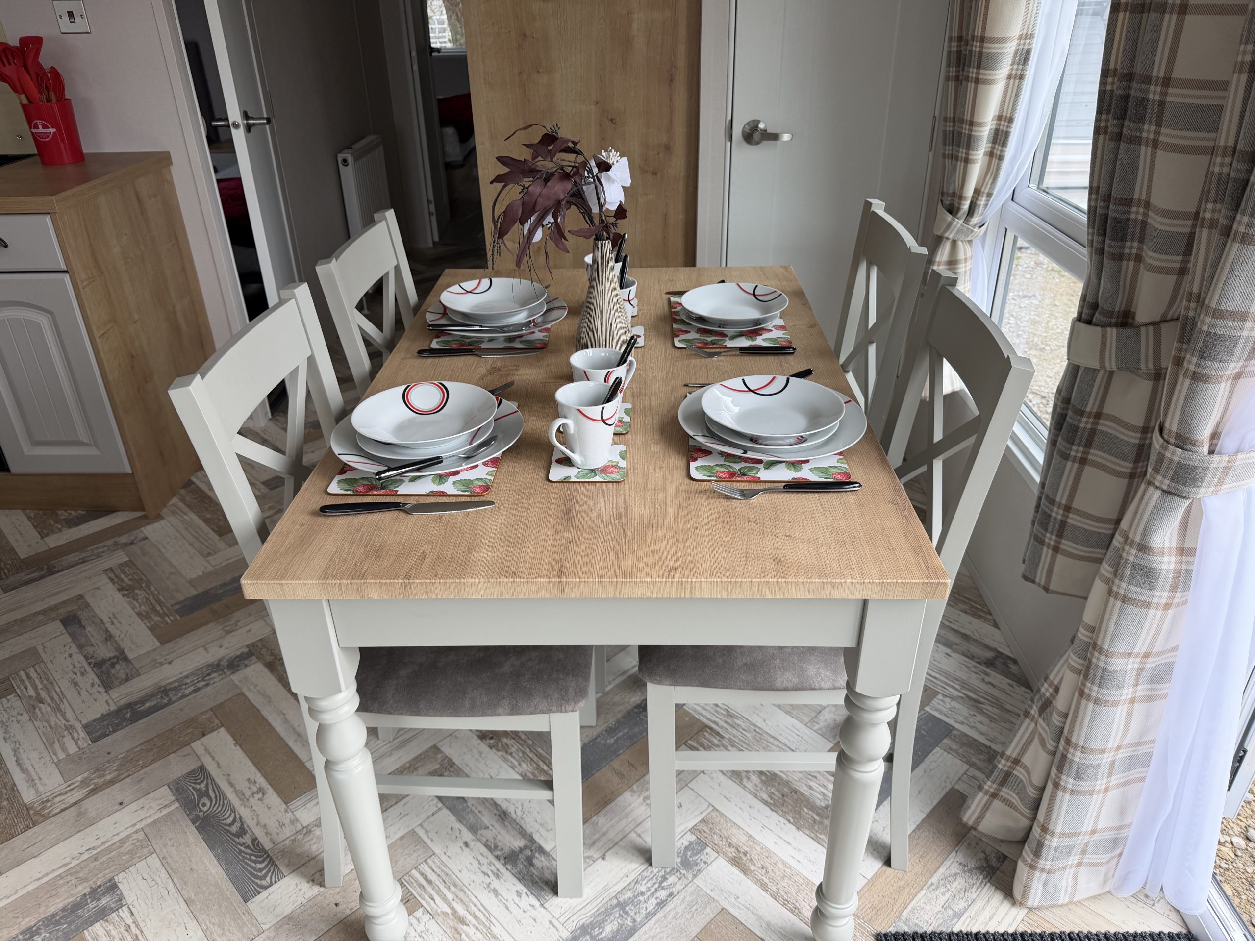 Inside, the well-equipped kitchen is perfect for preparing meals and entertaining family. It includes a domestic twin-cavity oven with hob, an overhead extractor hood, and plenty of storage space. Whether you’re cooking a family meal or a gourmet dinner, this kitchen has everything you need. Adjacent to the kitchen is a dining area featuring a stylish free-standing table and chairs, creating an inviting space to enjoy your meals.
